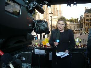 Bénédicte Paviot reporting for France 24 outside Westminster Abbey as Pope Benedict XVI arrives to attend a Service of Evening Prayer with the Archbishop of Canterbury, Dr Rowan Williams, in September 2010. |