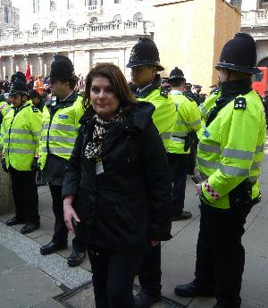 Bénédicte Paviot reporting live for France 24 from the anti-capitalist protests outside the Bank of England during the G20 summit in London. |